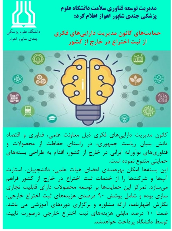 به استحضار میرساند کانون مدیریت داراییهای فکری ذیل معاونت علمی، فناوری و اقتصاد دانش بنیان ریاست جمهوری، در راستای حفاظت از محصولات و فناوریهای نوآورانه ایرانی در خارج از کشور، اقدام به طراحی بستههای حمایتی متنوع نموده است.
