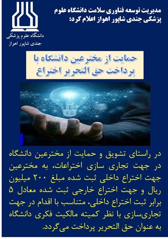 به استناد مصوبه هیات رئیسه دانشگاه در راستای تشویق و حمایت از مخترعین دانشگاه در جهت تجاری سازی اختراعات، به مخترعین جهت اختراع داخلی ثبت شده مبلغ 200 میلیون ریال و جهت اختراع خارجی ثبت شده معادل 5 برابر ثبت اختراع داخلی، متناسب با اقدام در جهت تجاری‌سازی با نظر کمیته مالکیت فکری دانشگاه به عنوان حق التحریر پرداخت می‌گردد.